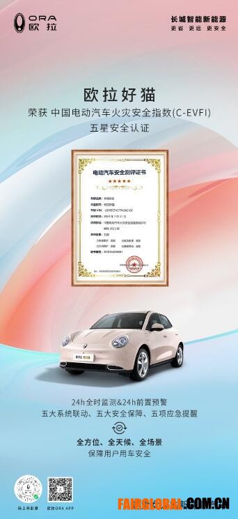 在用戶十分關(guān)注的電氣安全上,2024款歐拉好貓依舊不遺余力,整車416項整車電安全防護(hù)、24小時全時監(jiān)測&24小時前置預(yù)警,五大系統(tǒng)聯(lián)動等舉措,給予用戶更踏實的安全感。而中國電動汽車火災(zāi)安全指數(shù)(C-EVFI)五星安全評價的加持,進(jìn)一步印證了歐拉好貓在安全方面的過硬實力。
